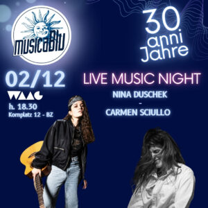 Waag si unisce a questa festa ospitando tre concerti in Piazza del Grano (25.11, 2+9.12), in cui si esibiranno insegnanti, allievi ed ex allievi dei corsi di MusicaBlu.
